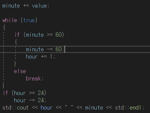 나는 다음과 같이 입력을 받으면 while문을 통해서 60분이 넘어가면 -60을 해주고 시간을 1시간 증가하도록 처리하였고