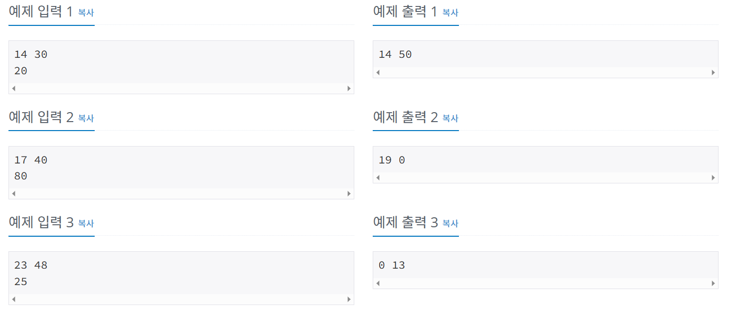 첫째 줄에는 현재 시각이 나온다. 현재 시각은 시 A (0 ≤ A ≤ 23) 와 분 B (0 ≤ B ≤ 59)가 정수로 빈칸을 사이에 두고 순서대로 주어진다. 두 번째 줄에는 요리하는 데 필요한 시간 C (0 ≤ C ≤ 1,000)가 분 단위로 주어진다.